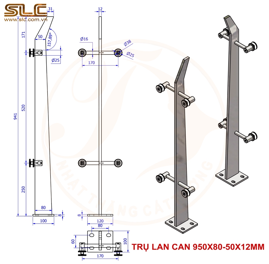 + TRỤ LAN CAN INOX SUS304 – KẾT CẤU KỸ THUẬT 950×80–50×12 MM