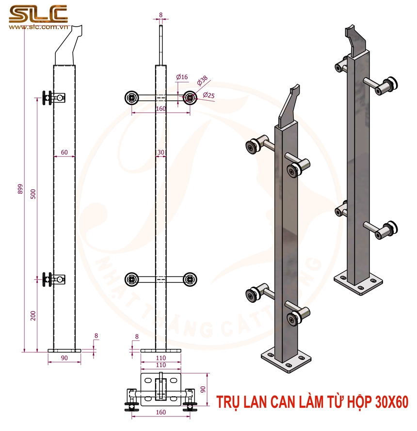 + Trụ lan can kính inox hộp 30×60 dày 1.5 mm