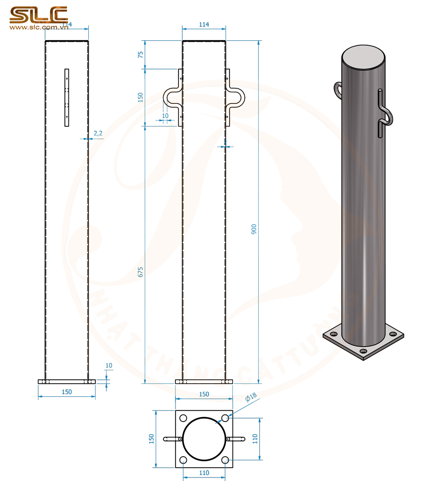 + Hệ trụ được sản xuất tại nhà máy Công ty TNHH Nhật Thăng Cát Tường (SLC) với kết cấu thân kép gồm 2 bản inox dày 8 mm, bản rộng 60 mm, chiều cao trụ 953 mm. Khi lắp đặt tay vịn hoàn chỉnh, chiều cao tổng thể đạt khoảng 1000 mm, phù hợp tiêu chuẩn lan can công cộng.