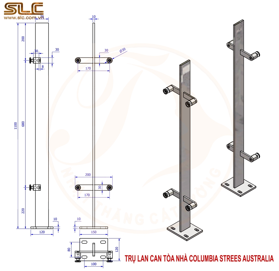 Mẫu trụ lan can kính này được sản xuất theo yêu cầu riêng cho dự án tòa nhà Columbia (Australia), đánh dấu một bước tiến quan trọng trong quá trình tham gia chuỗi cung ứng các công trình quốc tế của Công ty TNHH Nhật Thăng Cát Tường.